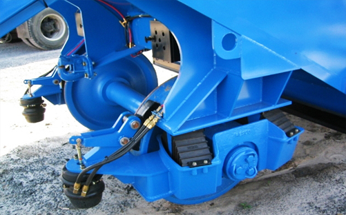 Railroad wheel/axles, self-steer suspension, fail safe air brakes.
